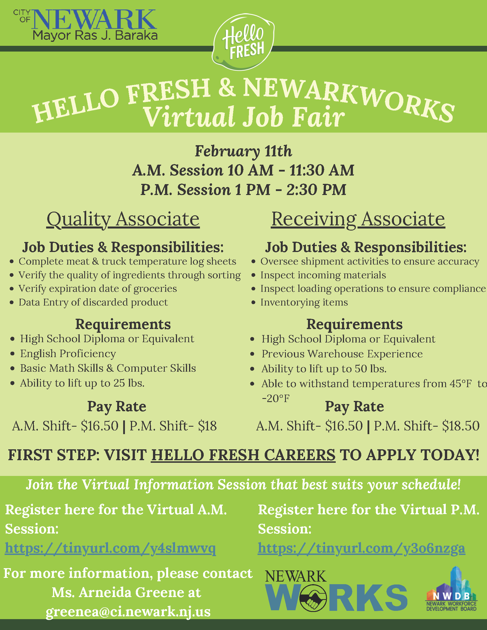 City Of Newark On Twitter On Thursday Feb 11 There Will Be A Virtual Job Fair With Newark Works And Hello Fresh For Quality Associates And Receiving Associates Register Here For Morning